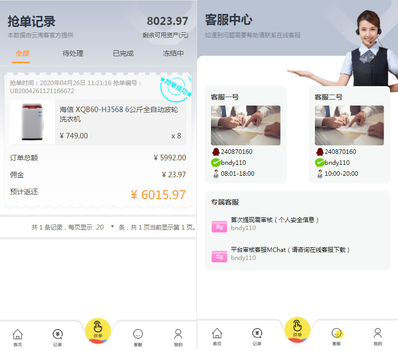 佣金是所抢金额的0.31%,可抢订单金额是余额的10-70%,每天可抢70单,抢单时间为每天8-20点。