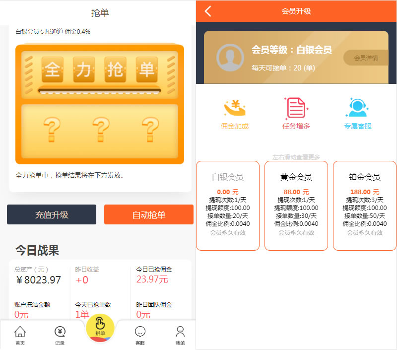 17.会员等级系统,支持各级会员收益比例与每天接单数量。自由设置各级会员提现手续费,自由设置开通会员价格